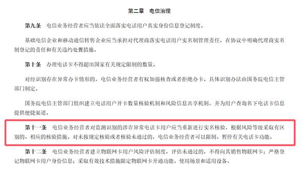 据了解,根据《中华人民共和国反电信网络诈骗法》第十一条规定,电信业务经营者对监测识别的涉诈异常电话卡用户应当重新进行实名核验,根据风险等级采取有区别的、相应的核验措施。